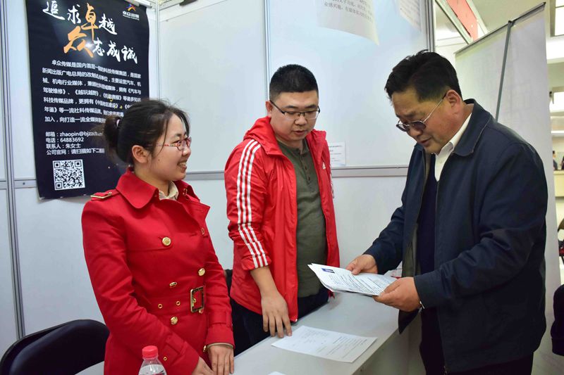 几位校领导在现场首先对前来招聘的用人单位表示了热烈欢迎,感谢用人单位带来的众多优质岗位以及对我校就业工作的大力支持。随后各位校领导来到单位展区,并与部分用人单位进行了深入细致的沟通。张德玉副书记详细询问了简历接收情况以及对学校就业工作的意见和建议,并积极推荐我校毕业生。他表示,我校毕业生就业态度积极、专业知识扎实、工作踏实肯干,多年来备受用人单位好评。欢迎用人单位今后多来我校开展招聘工作,校企双方共同促进大学生就业工作的全面进展。校友企业居然之家招聘专员李经理表示,在校园招聘领域学校每年全方位提供各类招聘服务,感谢校领导对此项工作的高度重视和学校多年来对校友单位各项工作的大力支持。
