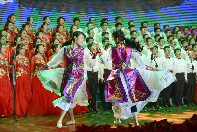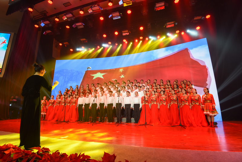 法学院、商学院、经济学院分别带来《唱支山歌给党听》《我们的生活充满阳光》《没有共产党就没有新中国》等,与在场观众一同回望那段被鲜血与汗水浇灌的历史,感怀新时代的绚丽多彩。与此同时,自选曲目表演也精彩纷呈。法学院的《达坂城的姑娘》活泼俏皮,商学院的《青春舞曲》热情洋溢,经济学院的《掀起你的盖头来》动感轻快。同学们身着少数民族特色服饰,踏着音乐起舞,用他们积极向上的风貌向党看齐。