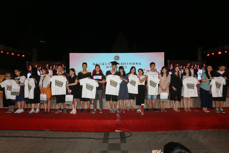 随后,九个学院的毕业生代表为母校送上了充满创意、饱含深情的礼物,表达对母校的热爱,对老师的感恩。理学院学子将亲手用6372个图钉拼成的求知广场拼图送给母校,擅长计算的他们用“6372=177名同学*大学4年*对工商的3种情感*对工商的3种祝福”表达了对母校四年培养的感激。食品学院毕业生送上了亲手烘焙的蛋糕,他们将以专业态度和使命,带着母校的期望出发,让专业素养精益求精。材机学院送给学校一幅由毕业生自主设计和制作的名为“我的大学”的电脑手绘图,感谢母校对同学们的肯定,表达了对未来的希望。计信学院将荣获第九届“挑战杯”首都大学生课外学术科技作品竞赛一等奖的会说话的智能机器人送给母校,表达了对母校培育的感谢。经济学院毕业生完成的名为“一带一路 犇腾向前”沙画作品,象征经院学子将乘势而上、顺势而行,努力拼搏,祝愿母校早日实现“双一流”建设目标,为社会输送更多卓越人才。商学院毕业生制作的以文二楼回廊为主要构图的七尺画卷,由商院学子用手印上色的我爱btbu寓意商院学子为母校点赞,为大学四年青春点赞。法学院双胞胎姐妹共同创作的画作《圆梦·启航》,象征法院学子在北工商圆梦,表达了对母校和学院深深的感恩之情。外国语学院67名学生为母校献上绘有学校标志性建筑物组成的工商书香尺牍画卷,寄托了同学们在工商四年的印记,代表了外语全体毕业生的祝福。艺术与传媒学院梦之队将亲手设计制作的毕业设计作品《船》送给母校留作纪念,寓意着工商学子扬起梦想的风帆再起航。战友协会代表送上了“携笔从戎、青春无悔”的书法作品,表达了对母校的真挚感谢。党委书记谭向勇代表学校接受了礼物,并与同学们合影留念。