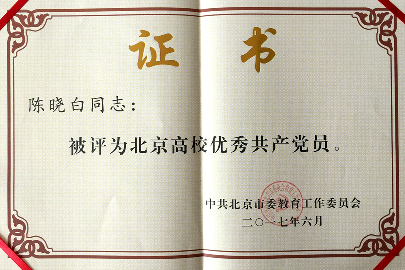 陈晓白教授入党30年来,始终牢记党的宗旨,将党员的先锋模范作用化为日常行为准则,坚持不断进取创新。从教几十年,始终以饱满的热情、深厚的感情、认真负责的态度和高超的教学艺术全身心对待每一堂课和每一个学生,将教书育人体现在课堂内外,深得学生的爱戴。