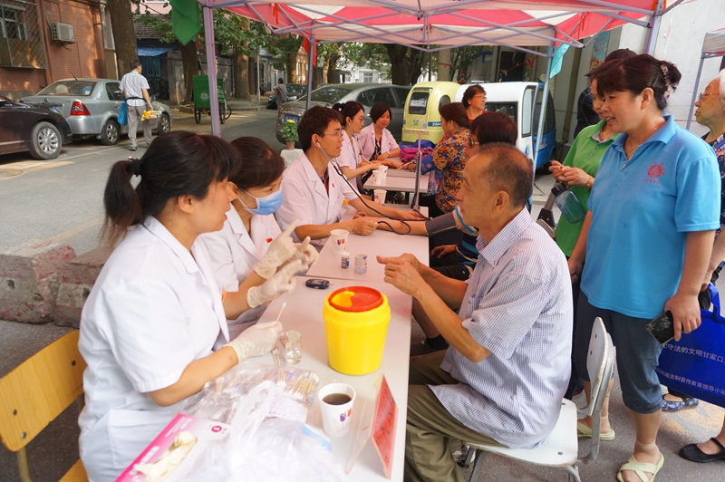 为纪念中国共产党成立96周年,进一步巩固“两学一做”学习教育成果,增强后勤党组织凝聚力,充分发挥党支部战斗堡垒作用和党员先锋模范作用,6月30日,后勤部门党总支联合学校社区居委会、解放军总医院第一附属医院(原三〇四医院)、甘家口社区医院、甘家口大厦、市热力集团、甘家口食药监所等多家单位,在阜成路西家属区开展了以“不忘初心跟党走,后勤喜迎十九大”为主题的党日活动。后勤部门党总支党员、入党积极分子、各科室骨干和相关单位100多人参与便民服务。