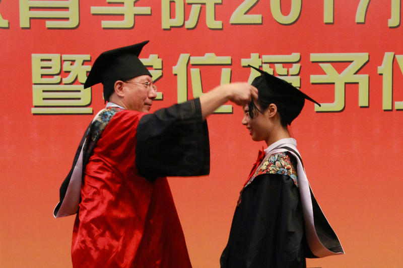 在欢快的音乐声中,学位授予仪式正式开始。谢志华副校长为学士学位获得者扶正流苏,颁发学士学位证书,并对他们取得的成绩表示祝贺。