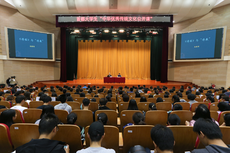赵敏俐教授讲解了《诗经》简介、分类、内涵和编辑目等基本知识,从历史、地域、内容、情感等十个方面介绍了《诗经》的经典和伟大。在讲述的过程中,赵教授引用了极其丰富的《诗经》内容,带领同学们一同体会了《蓼莪》的沉痛悲怆、凄恻动人;感受了《采薇》的爱国情怀,卫国之志;领悟了《淇奥》的高尚人格,理想风范;了解了《鹿鸣》的礼仪文明,高雅情调……一首首、一句句都引人入胜,让同学们真切地领略到《诗经》的魅力。赵教授表示,《诗经》不仅是具有巨大文化价值的经典,还是精心结撰的艺术,它既是大众的艺术,又是高雅的艺术;既表现了普通人民大众的世俗情感,又表现了当时人在精神境界上的最高追求。赵教授谈到,《诗经》在古代有着崇高的地位,它的影响渗透到当时贵族社会生活的方方面面,在塑造中华民族的人文精神和文化品格中起着重要的作用,揭示了其“寓教于乐”的艺术本质。