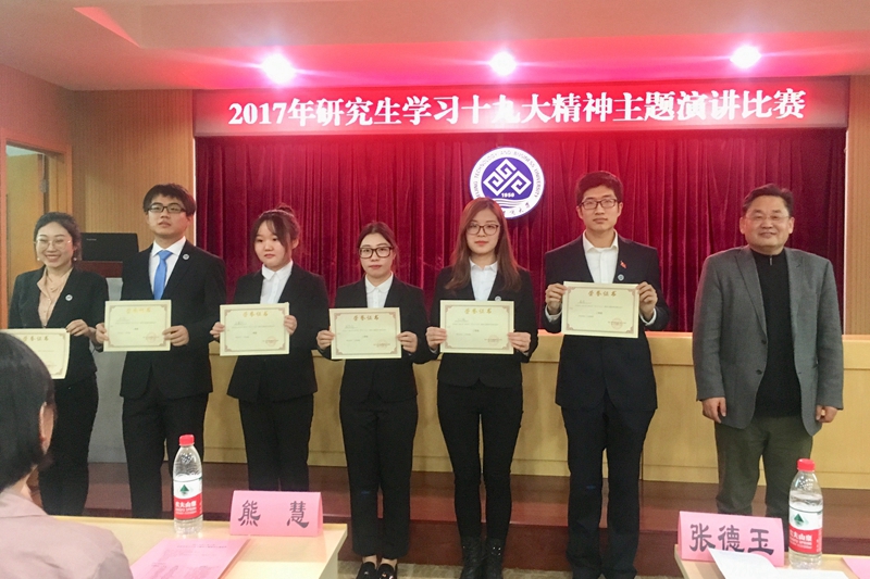 经过学院初赛进入决赛的15名选手依次讲述了自己对十九大精神的理解。来自商学院的池笑的《此间青年正当时》主题演讲,阐述了面对时代的召唤,当代青年应不负重托,一往无前;来自材机学院的刘祯从如何做一名合格的社会主义接班人出发,表达自己的爱国之情;来自法学院的刘溦的《脚踏实地方得始终》的演讲,从一代又一代人的奋斗和实干的故事中讲述了如何去脚踏实地实现自己的青春梦想;来自计信学院的董旭作了题为《我是一名青年党员》的演讲,从个人经历的角度讲述了自己作为一名青年党员的心路历程。比赛最终评选出一等奖1名、二等奖2名、三等奖3名、鼓励奖9名。与会领导为获奖选手颁发了荣誉证书并合影留念。