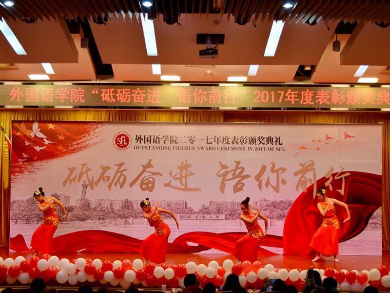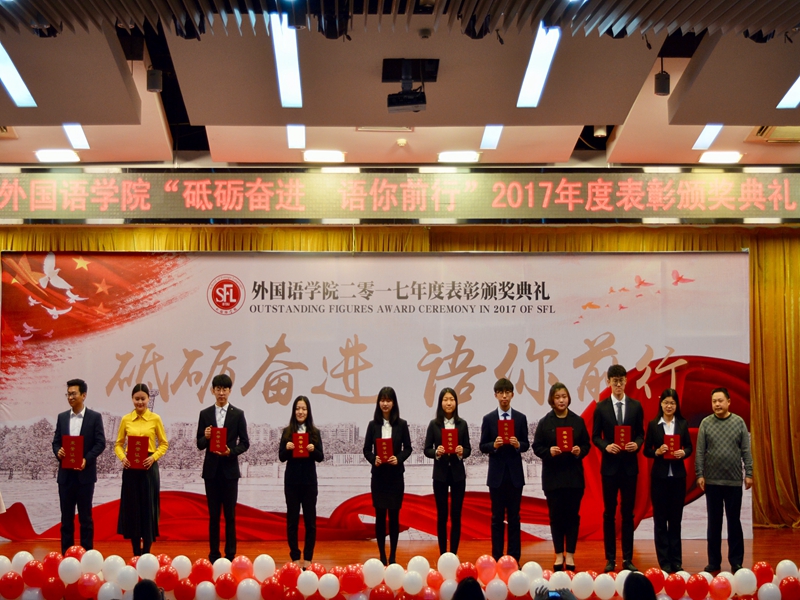 为表彰先进个人和集体,发挥榜样作用,12月13日,外国语学院举行2016-2017学年“砥砺奋进语你前行”表彰颁奖典礼。学院领导刘红艳、杨增成、苗天顺、任金晶与各系主任、辅导员、导师、班主任、本科生及研究生参加本次颁奖典礼。