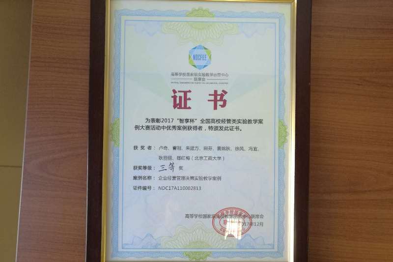 本次大赛收到来自厦门大学、武汉大学、南京大学、山东大学、中央财经大学、上海财经大学、对外经济贸易大学等39所高校的72个案例,共有32个案例、近160名参赛选手及观赛代表参加了总决赛。卢奇教授团队的《企业经营管理决策实验教学案例设计与应用》案例历经网络匿名评审、网络人气投票、决赛现场答辩等环节,最终从竞争激烈的管理组20个入围决赛案例中脱颖而出,位居第四。这是卢奇团队本学期获得的第2个实验教学大赛奖项。现场赛邀请了国内外十余位在案例教学、实践教学方面有着丰富经验的专家担任评委,专家们的提问与点评让参赛选手受益匪浅。