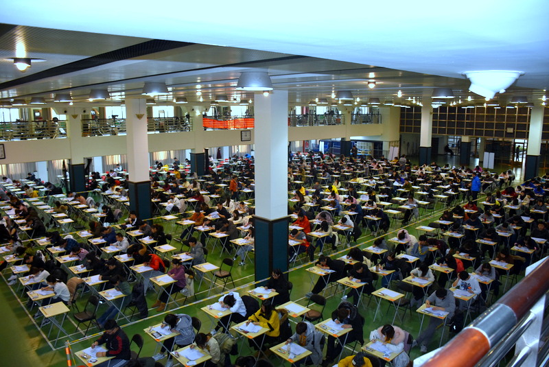 与以往集中考试不同,本次考试首次采用人脸识别身份验证设备对入座后的考生进行身份证和人脸双识别。每场开考前,考务工作人员对考生信息认真核查,考生携带准考证、身份证、学生证或一卡通才可进入考场。在工作人员的指引下,学生可以根据细致的考区分布图顺利找到座位,考场内秩序井然。期末考试期间,良乡校区文体馆考区举行了34场考试,阜成路校区教职工活动中心举行了30场考试,考试科目为校定必修课和专业基础课。高等数学、大学英语、大学物理、微积分、线性代数管理学、宏观经济学、会计学等科目采取相邻考生不同科目同场考试和同科考试不同试卷的方案,保证了考试的公平性和公正性。