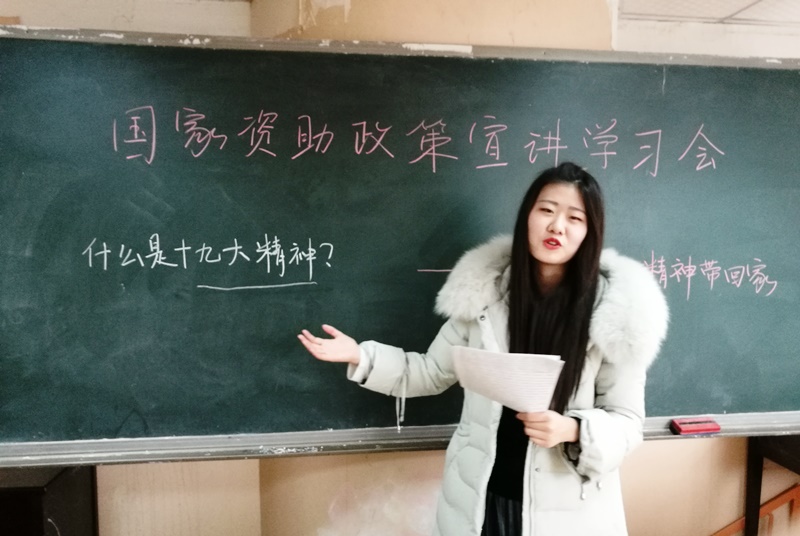 寒假前夕,学校从2016-2017学年国家奖学金、国家励志奖学金获得者中选拔20名品学兼优并有强烈志愿服务愿望的学生聘任为“学生资助宣传大使”。他们利用寒假返乡的机会,到高中母校、当地农村、社区宣传介绍国家资助政策以及自己如何在好政策的帮助下安心学习、成长成才的励志故事,并结合十九大胜利召开的契机,开展“我把十九大精神带回家”宣讲实践活动,以感恩之心回报国家关爱,力所能及地为家乡发展、为乡村振兴做贡献。