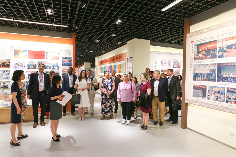 会见前,美国高校代表团一行在国际交流与合作处处长刘影的陪同下参观了良乡校区校史馆、图书馆和文科实践中心,并与相关部门的领导和老师进行了交流。