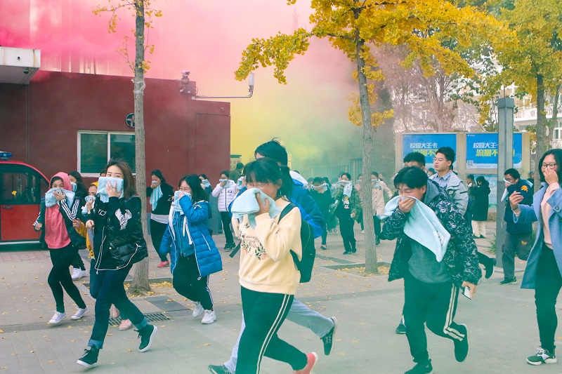 此次活动旨在全面实施“平安校园”建设提升工程,加强对“消防安全百日会战专项行动”的宣传教育,提高全校师生防火安全意识和火场逃生自救的能力,确保学校秋冬季防火安全。14时整,消防疏散演习正式开始,消防警报同时鸣响。模拟接到火灾报警后,微型消防站迅速到达火场实施灭火,参演学生从各组团学生宿舍快速疏散到集结区,完成了火灾逃生疏散,展示了学校在学生安全教育工作的良好成果。拱辰消防中队消防员为参演师生讲解灭火器使用方法,并现场演示了利用消防水带扑救火灾流程。保卫处在疏散集结地域内设置了“消防逃生体验帐篷”与“模拟灭火实训设备”,供学生实地体验疏散逃生和灭火器材使用。随后,参演师生现场进行了灭火演练实操。