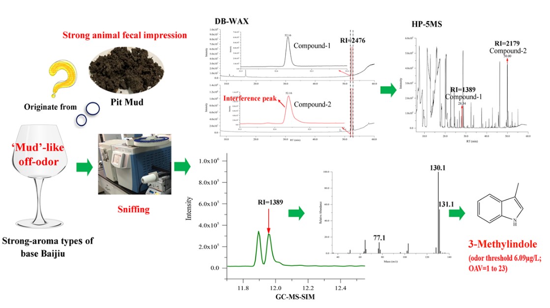 该研究以窖泥泥味明显的浓香型白酒为研究对象,综合LLE/SPME-GC-O-MS、GC-MS、双柱定性等多种手段,解决油酸乙酯作为共流出化合物的干扰,首次在白酒中发现一种具有马厩味、粪臭味的化合物3-甲基吲哚;结合感官评价(阈值测定、OAV、香气添加实验)及统计分析结果,验证了该化合物为浓香型原浆酒泥臭味的关键化合物。该研究进一步阐明了构成浓香型白酒“泥臭”风味特征的化学物质,具有原创性,获得了匿名审稿专家的充分肯定。同时此研究为提高浓香型白酒品质提供了新的努力方向,具有较高的理论意义和实用价值。