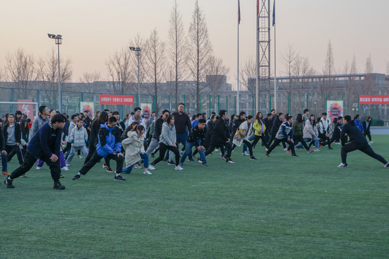 “第一节,伸展运动……”早上6点50分,良乡校区柏林蓝运动场上理学院、材机学院、计信学院、外国语学院的2018级学生们已经按时到达各学院指定的锻炼场地,在高年级学生干部的组织下做起了晨练准备活动。同学们在运动场上分批次进行晨跑热身,在初日的照耀下留下自己青春的烙印。