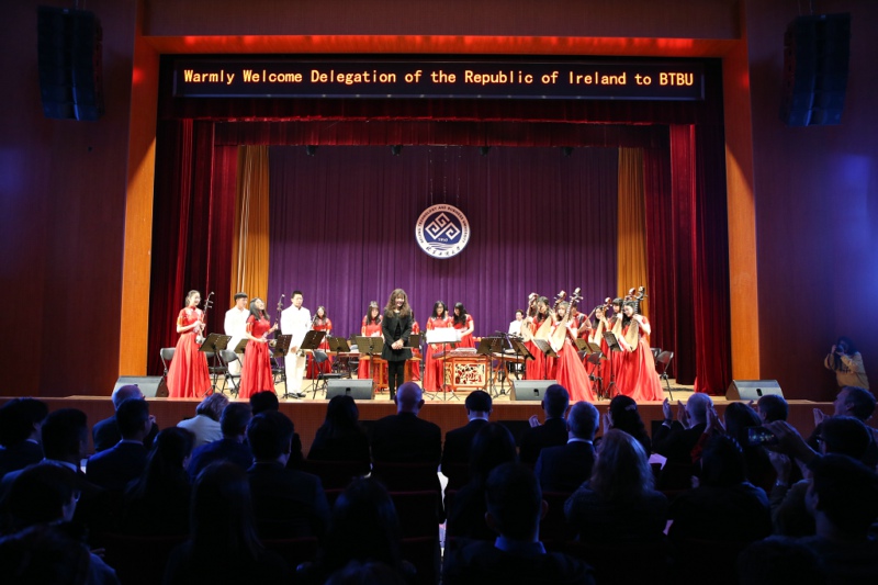 3月17日正值爱尔兰国庆日,来自我校的学生艺术团和来自爱尔兰的乐团在阜成路校区东区礼堂共同进行了“北工商爱尔兰日”交流演出。来自北工商的500多名学生代表和80多名留学生代表一同观看了演出。会谈结束后,在孙宝国校长和贾英民副校长的陪同下,部长代表团一行前往礼堂参加了此次活动。孙宝国校长、麦克休部长和谢百成校长分别在活动上致辞。