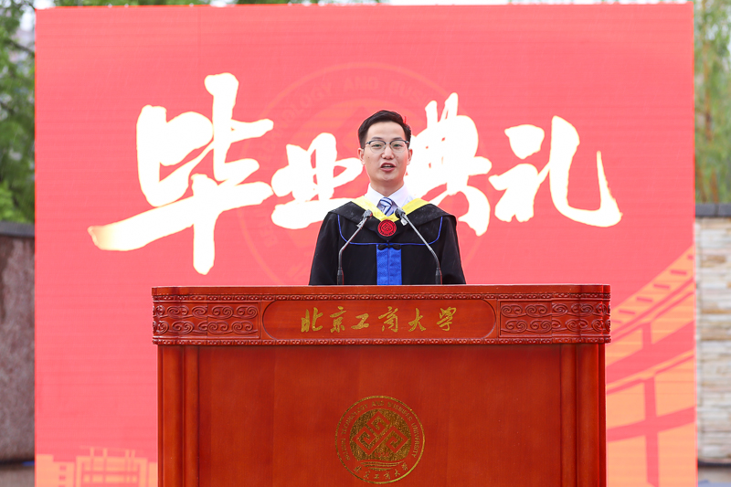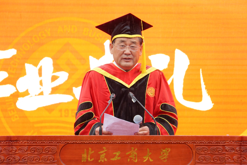 孙校长寄语即将离开母校、开启新征程的毕业生们:第一,要永葆感恩之心。要感谢父母的养育之恩、老师的教育之恩、学校的培养之恩。只要时刻都拥有一颗感恩的心,工作就会充满激情,生活就会充满欢乐,事业就会走向成功。他希望毕业生们传承北工商人感恩的传统,关心支持母校发展。第二,要永葆责任之心。同学们走出校门将面临前所未有的困难和挑战,要肩负起工作的责任、家庭的责任、社会的责任,肩负起时代赋予的中华民族伟大复兴的历史使命;要记住责任有多大,事业就有多大,要敢于负责,善于负责,干大事,担大责。第三,要永葆奋进之心。中华民族今天的成就是先辈用鲜血、汗水和智慧奋斗出来的。习近平总书记在“五四”100周年大会上讲到:“一代人有一代人的长征,一代人有一代人的担当。”国家民族需要同学们这一代在经济、社会、科技等各个领域百尺竿头、更进一步,要具有“当今之世,舍我其谁”的气概,砥砺意志、脚踏实地、奋勇前行、履职尽责,用当下去书写未来,用奋斗迎接美好的人生,中华民族伟大复兴的中国梦将会在你们这代人的奋斗下梦想成真。孙校长表示,母校将一如既往地关心、关注和支持同学们的发展,北工商永远是大家的坚强后盾和精神家园。他希望同学们在展翅高飞的同时,常回家看看,与母校分享成功的喜悦、分担失败的痛苦,并相约三十年后与同学们一同参加母校的百年庆典。
