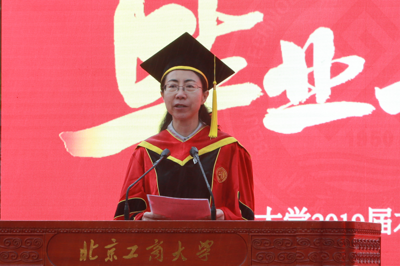 来自经济学院的老师姜竹教授作为教师代表谈到,同学们四年来在北工商这片沃土上汲取丰富的知识和给养,展示青春的风采与荣耀,收获成长。她希望站在人生新起点的毕业生们,一要始终保持奋斗之心,保持平和的心态,学会迎着困难找希望,通过自己的努力和奋斗实现目标。二要不忘初心坚持学习,树立终身学习的理念,主动适应社会、融入社会。三要认真学习做人做事,无论从事什么工作,都要诚实守信,善于与他人交流和沟通,懂得团队协作,在助人和互助中享受人生的快乐。她希望 “求真、立德、勤奋、创新”的校训永远与毕业生们相随相伴,希望大家常回母校看看,祝愿大家一路芬芳,大美无疆,在人生的舞台上秀出自己的风采。