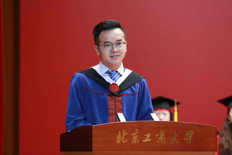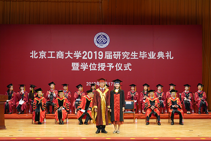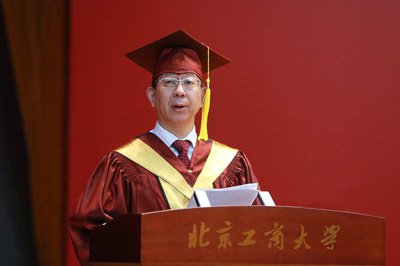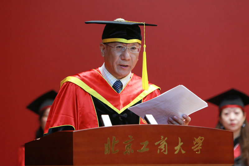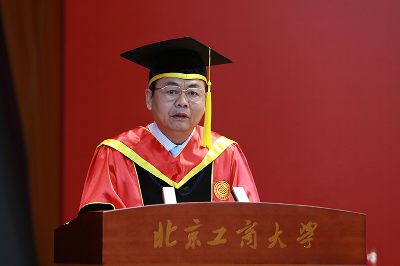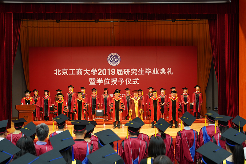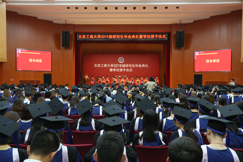 校长孙宝国院士讲话。他代表学校向获得博士学位的3位同学和获得硕士学位的1055名同学(含43名留学生)表示热烈的祝贺,向付出辛勤劳动的各位研究生导师和全体教职员工表示衷心的感谢,向前来参加毕业典礼的朋友们致以诚挚的问候。孙校长谈到,同学们在学期间是学校历史上教学、科研、学科建设发展最快的几年,获批博士学位授予单位、两个一级学科博士学位授权点,科研经费突破2亿,农业科学进入ESI全球前1%,这些成绩的取得有同学们贡献的智慧和力量。大家作为学校事业发展的参与者、见证者、推动者和创造者,以勤奋和努力奠定了承担重任的基础。同学们在学期间掌握了扎实的专业知识,受到了系统的科研训练,取得了创新性的研究成果,在学业进步的同时培养了自强不息、百折不挠的精神。2019届毕业生中,43人考取博士研究生,95人获评校级优秀毕业生,45人被推荐为市级优秀毕业生,49人获研究生国家奖学金;取得科研成果1012项,SCI收录论文109篇,EI收录论文53篇,CSSCI收录论文33篇,CSCD收录论文131篇,中文核心期刊134篇,获授权发明专利56件;获省部级以上奖励20项,其中获得的第十四届中国研究生数学建模竞赛、第八届中国大学生智能设计竞赛国家级一等奖,创造了我校同项赛事的历史最好记录。孙校长对即将奔赴人生新征途的毕业生们提出三点希望:第一,要做自信的追梦人。立鸿鹄之志,展骐骥之跃,做一个立言立行、只争朝夕的追梦人,把自己的人生放在对国家、对社会、对人民有意义的事业当中,创造出更大的人生价值。第二,要做踏实的筑梦人。成大事者要志存高远,更要脚踏实地、勤奋务实,还要学会交流与合作。做到能够换位思考,认真倾听别人的声音,有事多商量、有事好商量、有事会商量。第三,做有担当的圆梦人,勇于肩负时代赋予的责任。走出校门,挫折与困难无处不在,同学们要砥砺意志、勇于担当,坚持理想、脚踏实地,用奋斗迎接美好未来。孙校长希望同学们做好准备,带着在北工商收获的知识、能力和养成的勤奋、严谨的作风,自信、勇敢、坚定地走向人生下一站!无论同学们身处何境,母校都是大家坚强的后盾,希望同学们有机会常回家看看,走走当年的路,听听师长们的建议,同师弟师妹们分享成功的喜悦,并祝福大家在新的征途上一帆风顺,拥有成功的事业、幸福的家庭、健康的身体、无愧的人生!