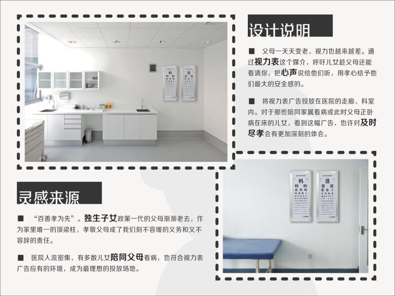 高伊茗同学的作品《标准孝心视力表》将视力表图形内容替换为对父母想说的心里话,巧妙地将视力表元素进行了创新应用,并借用视力表这一环境媒体,将其投放至医院走廊、科室内等公共场所,表达了尽孝要及时的核心概念,呼吁儿女趁父母还能看清你,把心声说给他们听,用孝心给予他们最大的安全感,同时希望那些陪同家属看病或此时父母正卧病在床的儿女们看到这幅广告,能够对及时尽孝有更加深刻的体会。