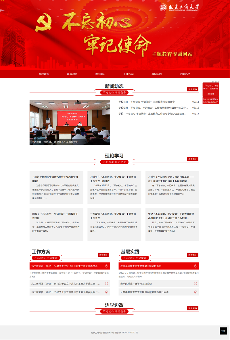 主题教育专题网站设置“新闻动态”“理论学习”“工作方案”“基层实践”“边学边改”5个栏目。其中“新闻动态”“基层实践”“边学边改”栏目将及时宣传报道学校部署开展主题教育的整体情况和重要活动,各级党组织主题教育的进展情况、经验做法和整改落实;“理论学习”主要传达习近平总书记关于主题教育的重要讲话、中央及上级部门有关文件会议精神与工作安排要求;“工作方案”主要发布我校主题教育相关文件。