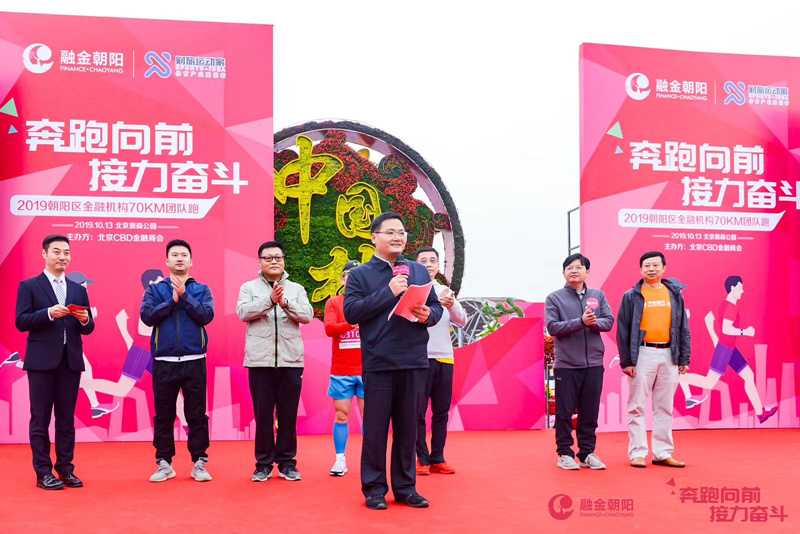 朝阳区副区长朱晟致开幕词,他向朝阳区1700多家金融机构对朝阳经济发展给予的助推表示感谢,并感谢我校志愿者们对本次活动的有力服务。商学院党委副书记樊江涛和领导嘉宾共同发令起跑,60多家金融机构的400余名选手争先恐后,竞相角逐,每个队伍由7名选手组成,环跑10公里,以团队合跑70公里向70周年国庆献礼。