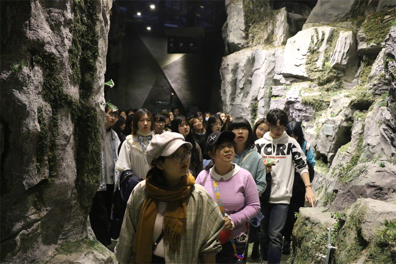 艺术与传媒学院300余名大一新生前往房山世界地质公园博物馆参观学习。在讲解员的指引下,工保辅导员邹萍萍和同学们从“时光隧道”开始了参观。同学们以历史发展为脉络,一步步了解地球地质的演化过程。通过地质岩石模型,同学们详细了解了岩石的形成过程及内部构造。原景复刻的“一线天”、钟乳石溶洞等典型的地质景观,吸引不少同学驻足观看学习。“地球从远古走来”的辽宁专题化石展也吸引了不少同学眼球,开拓了同学们的视野。