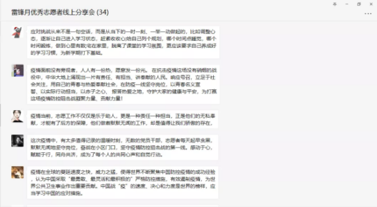2020年是毛泽东发表“向雷锋同志学习”的第57周年,为贯彻落实习近平总书记对志愿服务工作的重要指示,引导广大青年紧跟党的思想、着力推动学雷锋志愿服务活动深入开展,形成人人践行核心价值观、人人争当新时代楷模的生动局面。在第20个中国青年志愿者服务日到来之际,学校组织开展“弘扬雷锋精神 共行青春岁月”雷锋月线上主题教育活动,引领青年学子传承雷锋精神,真诚服务奉献,将雷锋精神与社会主义核心价值观充分结合,在疫情防控的关键阶段,众志成城,共克时艰。 各学院高度重视,积极响应学校号召并有序组织开展雷锋月线上主题教育活动,充分利用网络空间进行线上学习、交流分享,通过开展雷锋月主题故事交流、优秀志愿者事迹线上分享、疫情防控线上宣传、居家志愿服务、手绘图画、书法创作等形式,引导同学们弘扬雷锋精神,深刻理解雷锋精神的时代内涵和具体内容,在奋斗中奉献自己的青春力量,成为雷锋精神坚定的践行者。 理学院 3月5日起,理学院通过微信公众号共推出9名优秀志愿者事迹,开展线上交流分享会。优秀志愿者们在疫情期间做出了许多贡献,尽自己的努力为社会发光发热。 此次线上优秀志愿者事迹分享会包括志愿心得、志愿服务过程中遇到的困难以及志愿感想等,让理学院全体学生切身感受到雷锋精神就在我们的身边。新形势下深入开展学雷锋活动,大力弘扬雷锋精神,对于凝聚全民族奋发向上的精神力量、培养优秀社会主义接班人、实现伟大中国梦具有重要而深远的意义。 数学与统计学院 数学与统计学院的团员青年以雷锋月为契机,一扫居家隔离产生的低落心情,用自己的实际行动践行雷锋精神,一起度过这个难忘的学雷锋日。各班召开线上班会,传达雷锋精神,并号召大家为抗“疫”行动做一些力所能及的事。同学们积极参与其中,有的运用自己的画笔,画出心中对战胜疫情的美好祝愿;有的则用自己的实际行动,在家里进行卫生消毒;有条件的同学,更是在做好自身安全防护的基础上,参与到了社区的防疫活动中去。 此外,数统学院通过微信公众号发布推送的形式,分享抗“疫”英雄的感人事迹,激励同学们继承和发扬新时代雷锋精神,主动承担起青年学子应尽的责任,努力为国家和社会贡献出自己的力量。 食品与健康学院 食品与健康学院通过腾讯会议平台及“微信”视频通话等方式分组进行在线会议,以青年大学习和青春色情片“谁是雷锋”相关推送为学习材料进行学习讨论,分享心得感悟。要求同学们立足当下,向钟南山、李兰娟、火神山和雷神山背后的建设者以及“90”后医护人员等“现代雷锋”们学习,勇于担当、传播正义、知行合一,为打赢这场“抗疫”阻击战作出青年人应有的贡献。 食品192班王晓雨分享了她三月在社区做抗“疫”志愿期间的经历,她表示虽然已经开学,但是只要有较长的课余时间,她依旧会走上志愿者的岗位,为社区居民测量体温,对进出居民及车辆进行登记,她相信,凭借全国人民的努力,一定可以打赢这场战“疫”阻击战。食品191班刘正浩表示,父母都奋斗在一线工作,作为一名大学生自己也应有所行动。他自愿参与社区防疫工作,负责检查出入证、登记人员信息等工作。身在湖北黄冈的田捷希同学感慨到,她见证了其他人只有在网上才能看到的雷锋举动:政府关心问候,发放生活必需品;医生们恪尽职守,不知疲惫;志愿者们顶风逆行,化身为“移动菜场”……这一幕幕使身在疫区的她深深地感受到了什么是雷锋精神。 轻工科学技术学院 轻工科学技术学院积极组织各团支部同学利用课余时间,在网络上开展“弘扬雷锋精神,共行青春岁月”主题教育活动,通过一起学习雷锋故事,讲述自己对于雷锋精神的理解,分享自己身边的优秀志愿者事迹等形式引导同学们学习雷锋精神。在现实生活中,同学们也用自己的行动积极践行并传承着雷锋精神。 应化171班段小溪主动配合家乡的防控指示,积极申请成为疫情防控志愿者,对村口进出人员进行体温量测和信息登记工作,为开展疫情防控工作贡献平凡的力量;环境171班程琰瑞在疫情期间和众多志愿者一起投身社区卫生宣传服务,帮助社区分发卫生手册并引导大家做好防护;环境182班石岩喆主动参加社区防疫志愿服务工作,每天对小区进出人员进行体温量测和信息登记。他们为疫情防控贡献自己的青春力量,在行动中践行雷锋精神。 环境171班崔若琪主动帮助家人分担家务活,还时刻安慰父母,让一家人在疫情期间都保持良好的心态;应化192班殷一心每天都买菜做饭,让劳累一天的父母回家就能吃上热乎饭。还有很多同学在家里主动进行洗衣服、打扫卫生、洗碗等家务活,虽然是小事情,但也是雷锋精神的体现与传承。 与此同时,同学们通过绘画、书法、雕刻印章等作品发出声音,在文艺作品中体现他们对于雷峰精神的理解,用笔锋展信心,用翰墨传真情,积极宣扬雷锋精神,通过这些作品来引导大家学习并体会雷锋精神。 材料与机械工程学院 为引导学生了解雷锋的事迹,把握新时代雷锋精神的时代特征,材料与机械工程学院要求大一、大二、大三学年的各班开展线上主题教育活动。通过绘画、制作小视频、优秀志愿者事迹线上分享会、开展疫情防控线上宣传活动、引导学生帮助父母承担家务等各类居家志愿服务等形式开展活动。 有的同学对