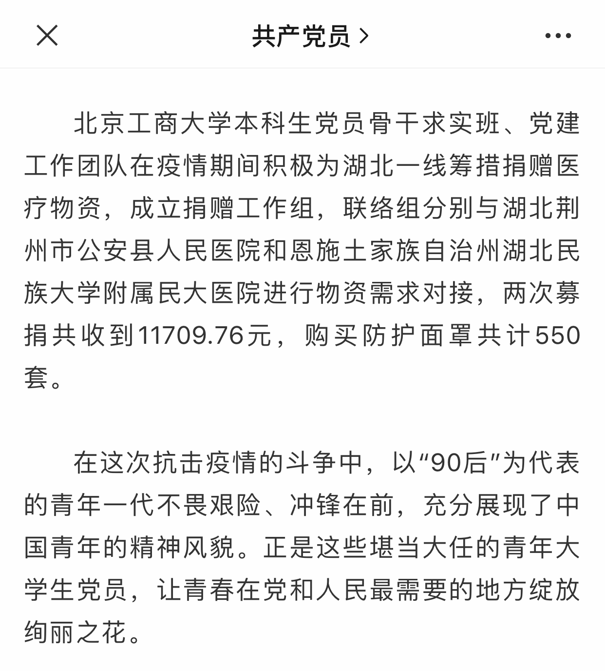 报道称,北工商本科生党员骨干“求实班”、党建工作团队积极为湖北一线筹措捐赠医疗物资,成立捐赠工作组,分别与湖北荆州市公安县人民医院和恩施土家族自治州湖北民族大学附属民大医院进行物资需求对接,两次募捐共收到11709.76元,购买防护面罩共计550套,充分展现了中国青年的精神风貌。报道一经发出,引起热烈反响。