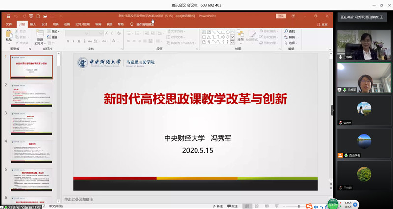 为迎接学校70周年校庆,5月15日上午,马克思主义学院通过腾讯会议举办了“迎校庆70周年”专题讲座暨第九期“问道玉渊潭”高端学术论坛。中央财经大学马克思主义学院院长、博士生导师冯秀军教授应邀作了题为“新时代高校思政课教学改革与创新”的专题报告。马克思主义学院院长王鲁娜、党总支副书记樊江涛、学院全体教师和研究生参加了此次论坛。论坛由学院副院长姚洪越主持。