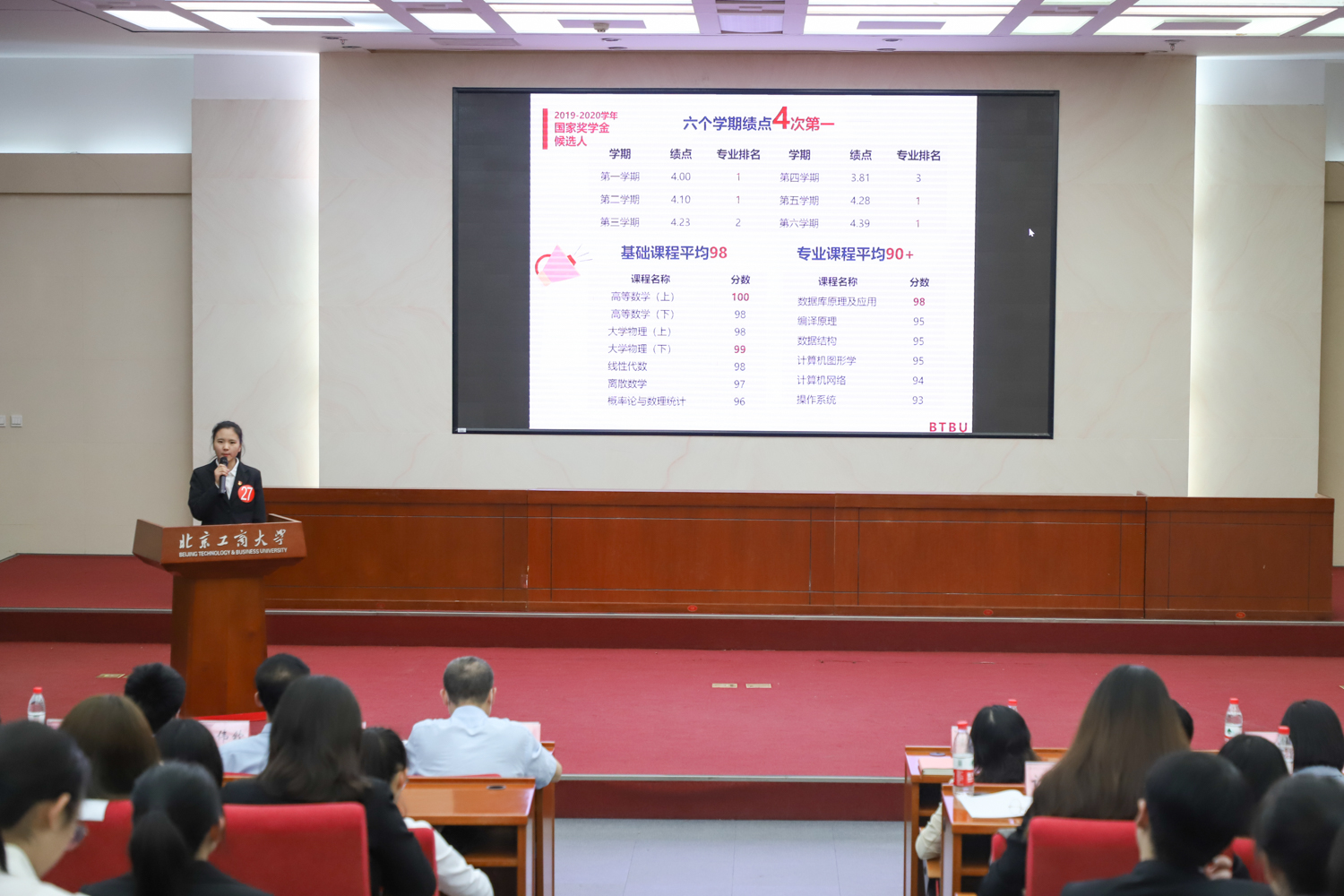 评审会在庄严的国歌声中开幕。来自14个学院的27名国家奖学金候选人按照抽签顺序依次上台,通过210秒的文稿演示展示自己在学习、科研、学生工作、社会实践、竞赛获奖、志愿服务等方面取得的成绩。数学与统计学院杜芳芳17门专业课在98分以上,其中7门专业课达到满分,获得全国数学竞赛二等奖等市级以上奖项9项,参与色情片市课题2项;食品与健康学院贾丁玮作为国家级大创科研项目负责人,论文现已发表于CDCD,北大核心期刊;轻工科学技术学院段琦积极参与学科竞赛并获得化工设计大赛全国二等奖、美国数学建模比赛三等奖、省部级奖4项;化学与材料工程学院魏诗艺积极进取,勇于科研创新,现已发表核心期刊论文2篇,并获得山东大学、中国科学院大学等6所高校的面试邀请和拟录取资格;生态环境学院石岩喆带领团队申请到国家级大创项目,获寒假返乡调研三等奖;人工智能学院肖芷瑄作为资深天文爱好者,参与多项天文相关志愿活动,作为国家级大创项目成员,参与一项新专利的研究开发;计算机学院李文静和班委们共同努力,带领班级四级通过率89.7%,被评为校级先进班集体;经济学院陈希阳学习实践两手抓,绩点综测连续三年双第一,发表一篇CSSCI,市场调查与分析大赛全国一等奖;商学院杨亿慧累计获得国家级、省部级和校级奖项60余项,发表论文4篇;电商与物流学院李佳丽作为学业辅导组织“商梦花开”总负责人,开设高数课程辅导,疫情期间带领团队筹划组织“停课不停学”系列课程,战“疫”故事被多家主流媒体转载,校内外反响强烈;法学院王雪溪凭着对法律的热爱,积极参加宪法演讲比赛和模拟法庭竞赛并创多项佳绩;外国语学院刘花荣作为校学生资助宣传大使多次参与河北蔚县桃花中学、南关希望中学、良乡五中、脑瘫患者等支教活动,帮助人数达200余人;传媒与设计学院张思诺综合素质优秀,蝉联校优秀学生一等奖学金,跨学科与团队协作斩获美国大学生数学建模竞赛S奖,并获得《中国青年报》优秀驻校记者、北工商建校70周年校歌创作大赛二等奖等多项荣誉,候选人的优秀事迹赢得了现场评委、老师同学们热烈的掌声。