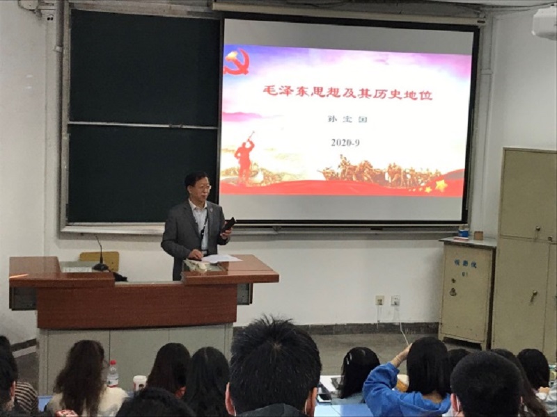 校长孙宝国院士用丰富的史实、大量的图片对毛泽东思想及其历史地位进行了生动的讲解,深入分析了毛泽东的成长历程、毛泽东思想的科学内容和历史地位、毛泽东思想指导下中国革命走向胜利和社会主义现代化建设取得的巨大成就。孙宝国校长对毛泽东和毛泽东思想的深情讲授,打动了学子们,同学们在课后和孙校长进行了互动交流。
