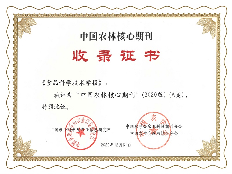 中国农林核心期刊评价工作自2005年启动,此次为第四届(前三届遴选的期刊名称为“中国农业核心期刊”)。该评价结果已成为农业信息研究所和中国农学会联合开展的期刊品牌工程,在涉农领域的学术界和期刊界产生良好的社会影响。本届“中国农林核心期刊”的遴选充分发挥期刊评价的导向作用,突出行业评价、学科评价的作用,以期刊发展的核心指标的定量评价和学科专家的定性评价为综合评价依据,对我国792种中、英文农林领域期刊的总体质量和发展水平进行全面梳理和科学分类评价,共遴选出13类280种核心期刊。分别为综合性农业类、农业大学学报类、农艺学与农作物类、园艺类、植物保护类、农业资源与生态环境类、农业工程与农业信息类、食品科学与农产品加工类、林业类、畜牧兽医与草业类、水产与渔业类、农业经济与农村发展类和特种种植养殖类。我校《食品科学技术学报》归入食品科学与农产品加工类核心期刊(A类)。