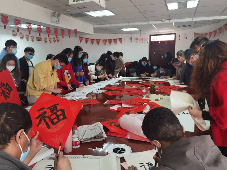 开展“师生共绘牛年福”活动。为确保留校学生身在学校也能体会到“家的温暖、年的味道”,学生工作部与研究生工作部等部门组织假期留校学生共同开展“师生共绘牛年福”活动,老师们为属牛的同学赠送牛年生肖吉祥物。传媒与设计学院退休教师夏京春为在场的师生详细介绍了过年写福字的习俗。从红纸黑字的渊源到关于“年”的传说以及“福”这个字的含义,在互动中让师生代表们了解了贴福字的时间、张贴福字的方向等过年习俗。巧写春联传心声,师生共绘牛年福。参加活动师生将福字也贴在宿舍楼大门前,让留校过年同学们的生活更有“年”味。