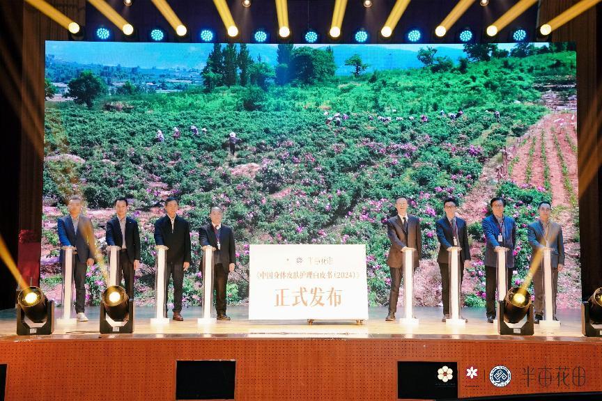 王万绪理事长、刘玮教授、董银卯教授、赵华教授、贾焱教授、周城教授、亓丰伟总经理、张晔翔博士共同按下启动按钮,《中国皮肤护理白皮书(2024)》正式发布。