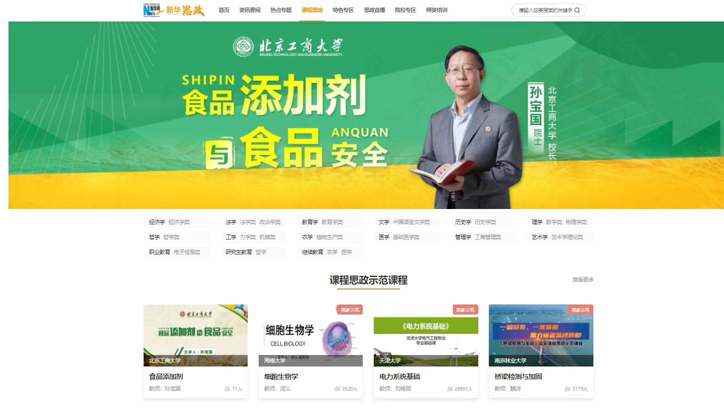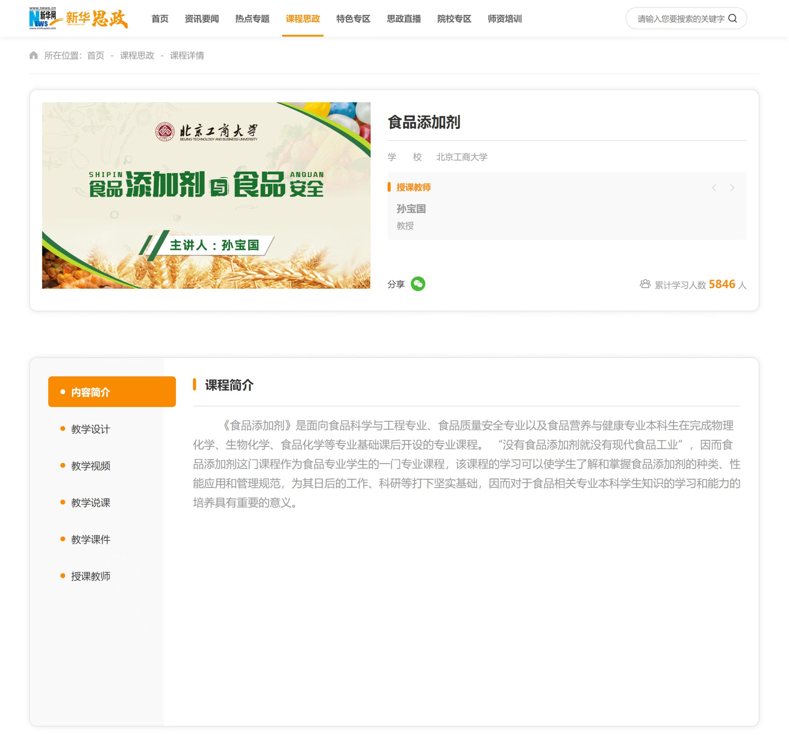 5月16日,从新华网获悉,我校课程思政优秀案例课程《食品添加剂》在“新华思政”-全国高校课程思政教学资源服务平台上线,面向全社会开放共享,该课程获新华课程思政栏目重点推荐。