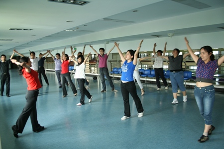 各基层工会的文体委员按照学校工会的要求,准时来到了良乡校区文体馆。年纪大的委员感慨几十年都没做广播操了;年轻的委员则在高中时曾做过操。时间流逝,对广播操的记忆日渐淡漠,大家对能否在短时间内学会明显信心不足。学校文体部委员、体育部副教授王立红老师的悉心指导很快打消了大家的顾虑,王老师舒展的身姿、优美的动作为大家起到了很好的示范作用,大家一节一节认真地跟着学,力求动作到位。当在广播操音乐的伴奏下,一气呵成完成了所有的动作时,大家露出了满意、胜利和自信的微笑。
