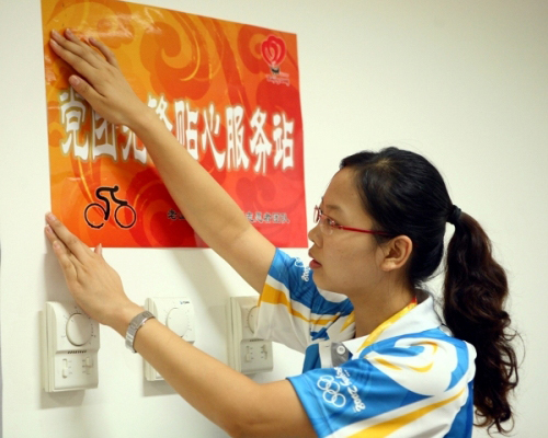 8月1日,志愿者团队运行组志愿者在卜晓媛老师的带领下开始装饰志愿者之家。志愿者之家内部被划分为“党团先锋贴心驿站”、“轻松驿站”、“学习园地”、“信息传输站”四个板块,这样可以使志愿者休息、娱乐、学习互不干扰。目前,老山自行车场馆群团队——志愿者之家组织管理办法、老山自行车场馆群团队——志愿者之家管理条例、各板块标识、微笑墙、涂鸦板等已被粘贴到位,液晶电视在前段时间已被放置到轻松驿站区。