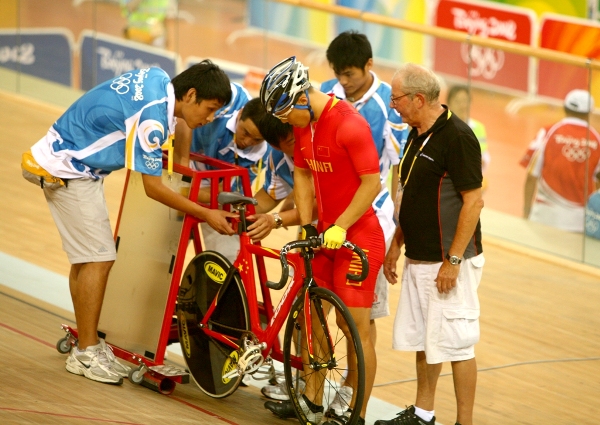 赛道上,竞赛组织的志愿者在反复调试着安装起跑器的位置。他们要将沉重的起跑器摆放在赛道的斜坡上,一人拉、一人推、一人拖电线,“放在白线上,别超过标志的前沿。”志愿者在工作中严格按照起跑器的摆放要求进行摆放,“可以用粉笔做记号,减少误差,减少对赛道的摩擦。”
