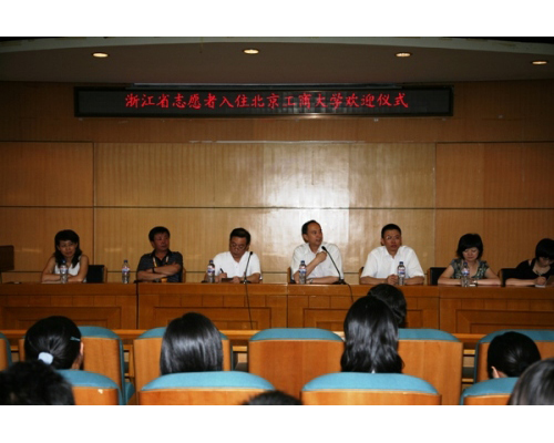 中午11点,学校在综合楼三层报告厅召开隆重的欢迎仪式,校党委副书记卢思锋、浙江团省委副书记徐旭和团中央联络员贾国群等领导参加了仪式并在主席台就座。在讲话中,卢思锋副书记代表全校所有党政领导对浙江志愿者的到来表示欢迎,并向浙江志愿者介绍了我校的概况以及我校志愿者的基本情况。卢思锋强调,老山场馆大部分志愿者都将在室外工作,天气炎热,志愿服务将会很辛苦,这必然会加重志愿者工作的困难,但是他相信,浙江志愿者和我校志愿者一定会团结合作,出色地完成志愿服务。我校志愿者代表李明英发言表示, 在服务中,学校志愿者和浙江志愿者会共同努力,精诚合作,坚持祖国利益高于一切,珍惜团队荣誉,精益求精服务奥运,努力创造志愿者团队的辉煌,做建设色情片、服务奥运的和谐先锋。浙江志愿者代表也表示,工商大学给了他们一种归属感,让他们真正的感到了自己是这个大家庭中的一员,并且代表全体浙江志愿者对我校的热情款待表示感谢。此外,我校带队志愿者还与浙江志愿者一起观看了平安奥运宣传片,增强了对平安奥运重要性的认识。