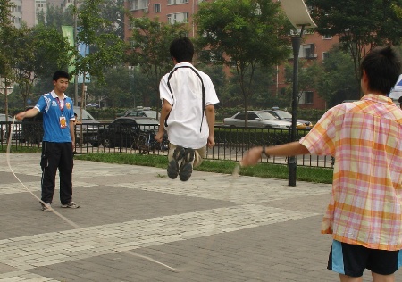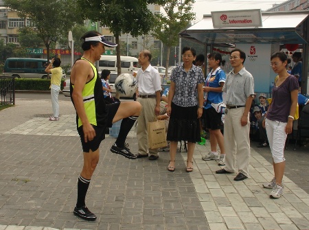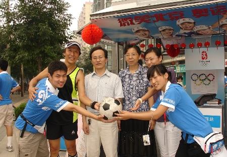 到达第三站——增光家苑站点时,正值站点举办“传递奥运精神 传承体育文化”的趣味体育活动。颠球、踢毽子、跳皮筋儿、抖空竹……居民们纷纷参与进来,展露出自己的绝活儿。志愿者们还接待了一位年逾花甲的足球爱好者。老人家特地带来了写满签名和留言的足球,据老人介绍,这个足球是2001年中国足球冲出亚洲进入世界杯时自己珍藏的,到现在已有七年之久。老人还专门表演了颠球、顶球的绝技,赢得了在场市民和志愿者们的高声欢呼。