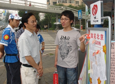 8月6日,我校化工学院院长田媛、党总支副书记徐宝财在几位辅导员的陪同下一同看望并慰问了坚持在酷暑中服务奥运的城市志愿者。