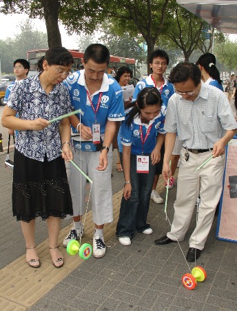 领导们兴致勃勃的参观了志愿者们亲手设计、布置的服务岗亭,并亲身体验了一把抖空竹的绝活儿,将现场气氛推向高潮。