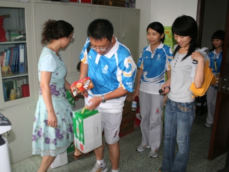 志愿者代表们首先汇报了一个多月的工作和感受。来自体育部的王立红副教授是其中唯一的有教师身份也是年龄最大的志愿者,她是老山自行车馆啦啦队志愿者的领队。作为体育教师的王老师,虽然身体素质很好,但是炎炎夏季,酷暑难当,带学生上山演练,坐公交车往返老山赛场、每天的正襟危坐,虽使她颇感疲劳,但是每每想到自己和学生啦啦队的言行举止代表的不仅是自己,而是学校、是高校、是民族与国家时,她和学生们就能抖擞精神,勤练苦练。徐红京与魏曼竹、程显臣、王磊四名教师是我校承担的国家体育场看台互动志愿者领队,他们带领90名学生志愿者团结协作,取得了令人自豪的绩。这些国家体育场看台互动志愿者不仅一站就是七个小时,还要充分调动观众的情绪,掀起一阵一阵的人浪。经过紧张的排练和彩排的实战演练,他们的动作很投入、忘我和优美,得到了奥组委有关部门的表扬。作为奥运村60名志愿者的领队,团委副书记文四英和4位带队老师,克服一系列困难,坚持巡岗、替岗,和学生交谈,解决学生实际困难,既响应奥组委的要求提高学生志愿者的素质,又送去了学校对学生志愿者的关心和爱护。早在去年四月就去老山自行车馆工作的观众服务经理何耐铭和志愿者经理吕良在长达一年的工作中体会更深,筹备工作不仅琐碎而且任务繁重,需要多方协商解决,需要勇担责任。令他们欣喜的是他们前期的工作成果得到了上级主管部门的首肯,和今年7月入住场馆的我校329名进行观众服务的学生志愿者、11个主管老师和保研的领队志愿者分工协作也非常愉快,老山场馆师生志愿者们非常敬业、十分团结,坚守岗位、有序工作。