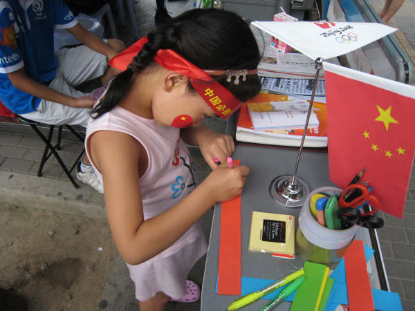在这段服务奥运的日子里,身为志愿者的我们感受到了太多的关爱与支持!时常会有路人把自己的地图送给我们的站点,方便我们为更多的友人服务;时常会有住在附近的朋友每天下班后都过来与我们聊天,帮我们一起解决问题;更忘不了年过7旬的老爷爷过来和我们一起唱《朋友》,也忘不了可爱的小朋友每天在公交车站等车时都来我们站点的爱心贴板上留言,还有为我们提供帮助的同学——把自己唯一一套央视国际的转播计划和场馆地图等送给了我们服务的站点等等等等。
