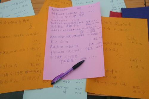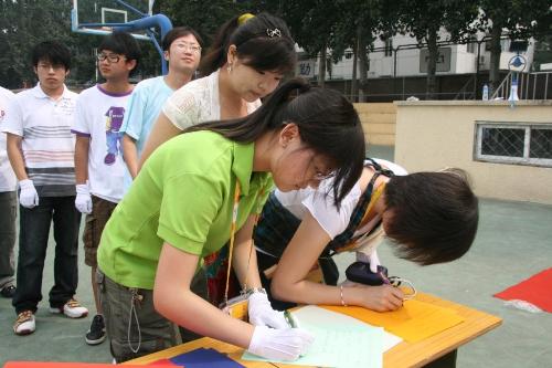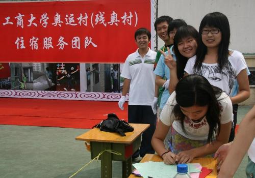 A3分团陈雪雷同学在完成了传递之后笑容灿烂地感慨道:“百年奥运,百年梦想,它饱含了全国人民付出的努力和心血——传递火炬恰恰就是见证.能够有机会与火炬亲密接触真是太荣幸了!”同学们纷纷在留言簿上写下心语表达对奥运的祝福。带队老师们心情也格外激动,纷纷加入到喜迎火炬的队伍中,大家振臂高呼:“北工商加油!奥运加油!”