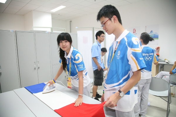 颁奖仪式通用志愿者在颁奖仪式等候区有条不紊地熨烫各国家国旗。据该业务口王璇介绍,此次他们所准备的十三面国旗正是为了今天下午四点半的男子团体竞速赛。之前国旗是被整齐叠放在袋子中的,所以会有明显折痕,他们要把每个折痕一点一点地熨烫平整。熨烫平整后,要把每面国旗穿上旗杆并反复核对上下及正反面后放到大架子上,到赛会结束后要严格保证这十三面国旗不被弄湿、弄褶。