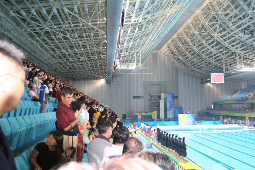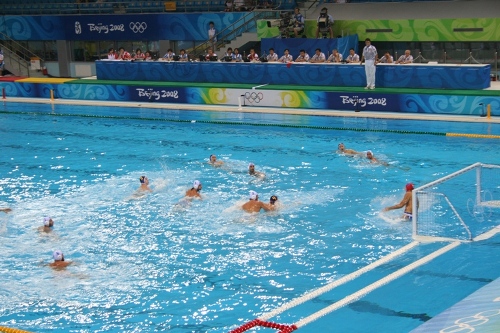 比赛准时开始,大家饶有兴趣地观看了第一场加拿大队对意大利的比赛,在观看中和现场的解说中大家很快了解了水球比赛的规则。第二场比赛是中国男子水球队对希腊男子水球队的比赛尽管中国男队实力与希腊队有一定的悬殊,但是中国男队表现出顽强的拼搏精神,博得了观众热烈的掌声。我校临时组建的啦啦队更是不甘示弱,一双双手臂忘情地挥舞,一声声呐喊在体育馆上空回荡。尽管中国队最终以8:13不敌希腊队,大家仍然和全场观众一起为中国队队员鼓掌,并向希腊队表示祝贺。