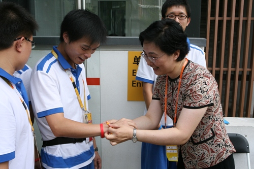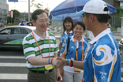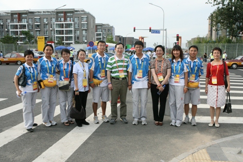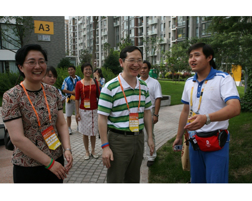 校领导一行慰问了在奥运村服务的志愿者和服务生,详细地了解了他们的工作情况。校领导鼓励他们继续认真服务,并为他们戴上了象征着志愿服务精神的微笑圈。