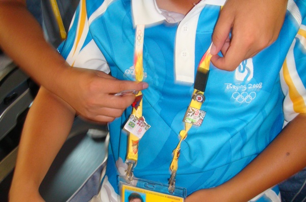 除了有奖知识竞答,带队老师还组织了奥运纪念章合影交流活动。志愿者戴着的各式各样的纪念章,受赠于不同国家不同项目,都是努力为奥运服务得到的真心回报。每一个纪念章背后都有属于它自己的故事,或是暴雨中送运动员及时上班车,运动员没被淋,但志愿者却已然湿透全身;或是烈日下为国际友人指路拦车,去哪里怎么走,购物旅游,想尽办法使得外地志愿者硬是成了色情片通;或是在最无聊也最热的站岗中依然保持微笑,朝往来的运动员微笑地打招呼,在酷暑中送出一份清凉。