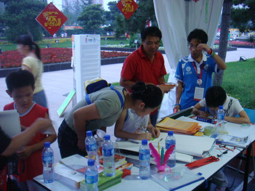 很多记者都到现场来采访,一名国际广播电台的记者问我们其中的一名志愿者:“奥运会已经结束了,你们还留在这里做什么?”志愿者回答:“奥运会结束了,但我们还会继续留在这里,为更多的人提供服务,帮助更多有困难的人。”志愿者们将自己精心编制的五环颜色的中国结送给了记者及团区委的领导们,令他们非常开心。