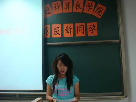 来自软件061班的代颖超代表全体老生对2008级新生的到来表示欢迎。她希望同学们明确目标,扎实地学好基础知识,同时广泛涉猎相关专业知识,努力成为时代的精英。同时提高自身的综合素质,健全自己的人格,与计算机学院一起腾飞;与祖国一起奏响时代的华章!
