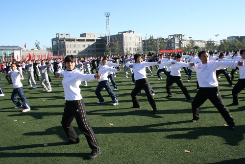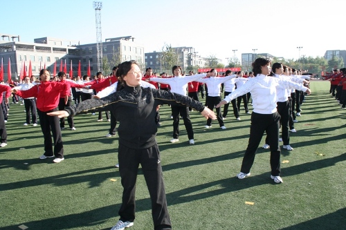 上学期末,学校恢复了工间操。本学期初,学校决定举办教职工第八套广播操表演赛。一个月以来,各基层工会主席认真组织,各级党政领导大力支持,广大教师积极响应,全校上下都行动起来学习第八套广播体操。很多教学单位克服白天老师课多、人无法聚齐的困难,选择在晚上、在周末苦练;职能部门和教辅单位针对两地办公、人员分散的现状,决定先看光盘以部门为单位小规模练习,再集中起来纠错,统一动作。各基层单位不仅从资金上大力支持本项活动,广大的中层干部还主动申请成为参赛队伍的一员积极备战;很多老师更是克服孩子小、家住得远、课多、科研任务重等困难,尽最大努力参加赛前的练习。一次次的训练,使教工们深深体会到积极开展广播操活动,能起到舒展身体、放松身心、减轻压力的良好作用。有的基层工会甚至还倡议本单位周二的集中一定在会前会中和会后做三遍广播操。